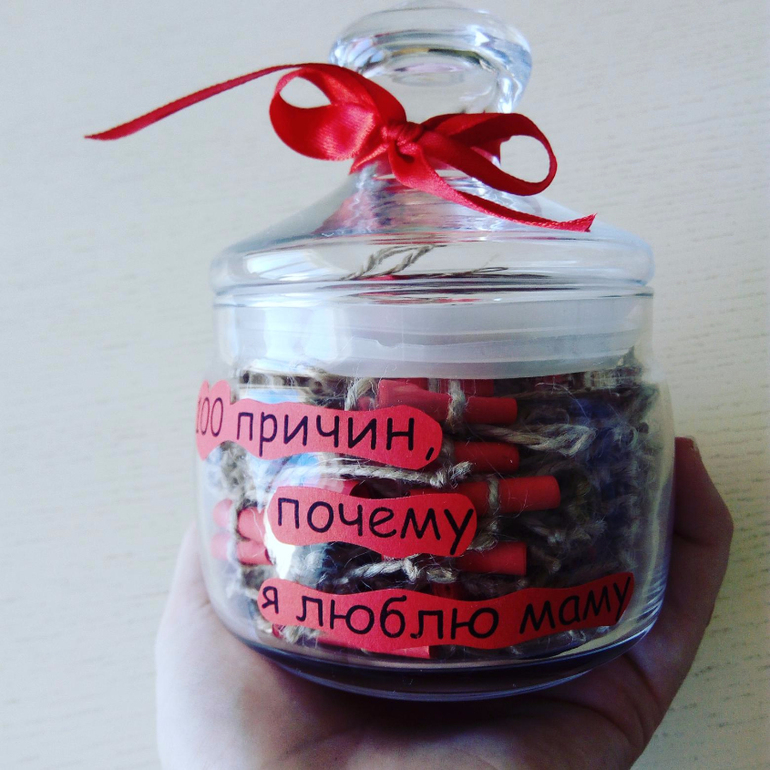 РазноеДрузья, приближаются праздники и я предлагаю Вам поздравить своих любимых МАМ, ПАП, вторых половинок, подруг, милыми баночками с записочками "101 причина, почему я люблю тебя" Иногда так трудно выразить словами свои чувства, и многим проще написать, чем сказать. В наш информационный век мы привыкли читать все послания в электронном виде и теперь даже маленькая записочка способна вызвать умиление и трепет. А если это не одна, а целые десятки таких записочек!? Представили? Кто-то прочтет их разом, а кто-то растянет удовольствие на долгие дни :) После прочтения баночку можно использовать по прямому назначению, как емкость для хранения специй, конфет, различных мелочей......Вот такой многофункциональный подарок! 600р