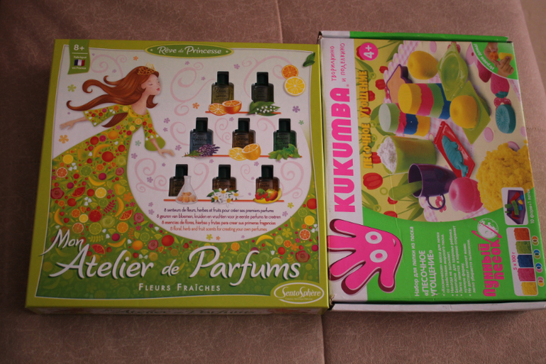 Мечта девочки любого возраста - набор для создания духов. В наборе есть всё: парфюмерные масла (нежные, вкусные, на мой взгляд, гораздо удачнее тяжеловатого восточного набора), пипетки, флаконы для смешивания, распылители, инструкция с рецептами. Новый стоит почти 3000 тысячи! Это не Китай, не Россия - французская известная фирма по создания аромо-игр для детей! Но моя дочь пока больше любит мамины духи) подрастет -возьмём опять. Использовали всего несколько капель - создали 1 духи, т.е. почти новый!