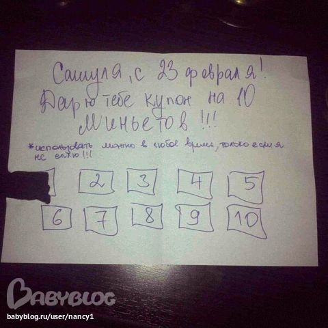 подарила,торжественно.смеялись капец.попросила собачку выгулять в неочереди и сама говорю ,с меня мин...т.А он:у меня еще 10 талонов что другое предлагай.