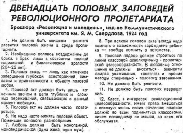 с 12 пунктом вообще интересная вещь. Эти заповеди так сказать ввели уже после того, как те же комсомольские ячейки создали "Общество долой стыд", а Теорию "Стакана воды" которую в свое время проповедовали Александра Колонтай и Клара Цеткин. Согласно этой теории половые отношения между мужчиной и женщиной уподоблялись любому другому физиологическому акту, например, утолению жажды. "Любви нет, есть только инстинктивная потребность", - утверждали коммунисты."Нынешняя мораль нашей молодежи в кратком изложении состоит в следующем, - утверждала известная коммунистка Смидович в газете "Правда" (21 марта 1925 г.). - Каждый, даже несовершеннолетний, комсомолец и каждый студент "рабфака" имеет право и обязан удовлетворять свои сексуальные потребности. Это понятие сделалось аксиомой, и воздержание рассматривают как ограниченность, свойственную буржуазному мышлению. Если мужчина вожделеет к юной девушке, будь она студенткой, работницей или даже девушкой школьного возраста, то девушка обязана подчиниться этому вожделению, иначе ее сочтут буржуазной дочкой, недостойной называться истинной коммунисткой…"