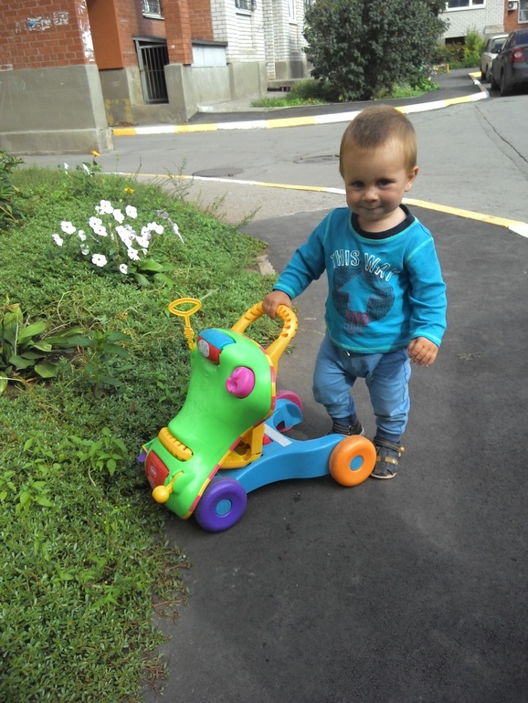 Такой прикольный))) А нам жалко такую каталку на улицу))) Мы дома с ней иногда что-то делаем)) но ходить он любит без нее