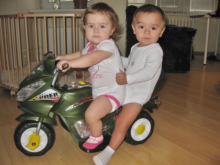 Наши детки-конфетки ( развитие, радости, трудности и т.д )Все руки не доходили писать т.к. малышня уже вполне самостоятельная и расслабиться не дают. Активно юзают мышку от компьютера, включают выключают телевизор, переключают каналы или нажимают звук до конца, а потом разбегаются со страху, причем на карачках, хотя оба ходят. Тимурка пошел в 11 месяцев и уже бегает, а Дилька в 1.1. , но зато она раньше говорить начала. Говорит мама, папа, дай, ало, пока и ата та, показывает глазки, носик, ротик, собирает стенку из резиновых кубиков. И постоянно болтает на своем тарабарском, причем с выражением и умным видом. А Тимурка говорит только мама и дай и то, когда что - то нужно. Этот парень - настоящий ураган, привлечь его внимание очень сложно, он всегда занят свои делом, а именно разрушением дома. ОН его разбирает по кусочку, а сестра помогает. В квартире оторваны все плинтуса, обои висят клочьями. Везде стоят ограничители, блокираторы и заглушки и не дай Бог что- то забудешь закрыть, он сразу откроет и выпотрошит. Причем с утра идет проверять, может, что забыли то прикрыть. Стулья все спрятаны в кладовку, т.к. они их двигают по всему дому и роняют ,стулья большие и металлические. А еще он всем выключает свет в туалете и прячет предметы, причем кладет куда-нибудь повыше своего роста, особенно любит припрятать свои носки и мои тапки.