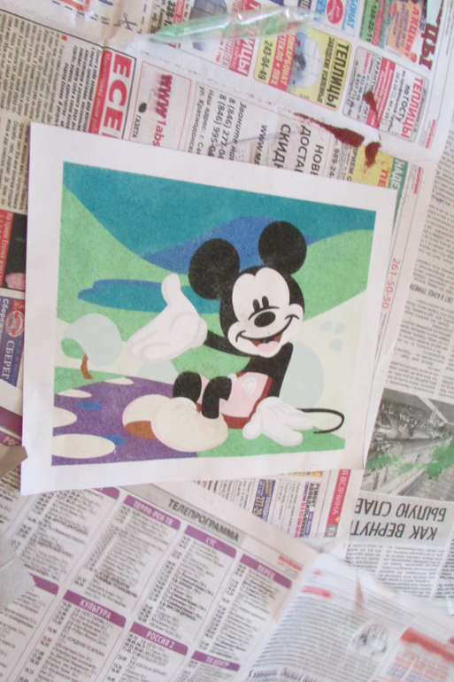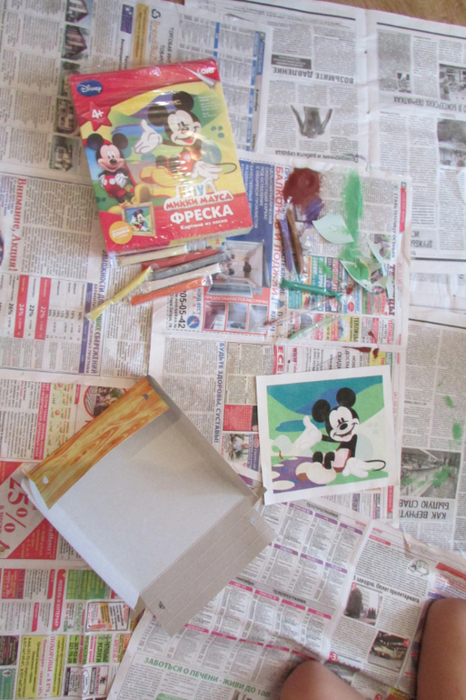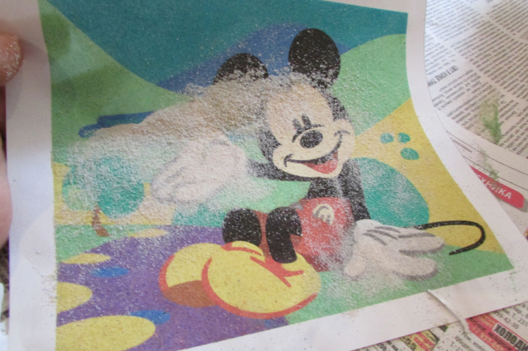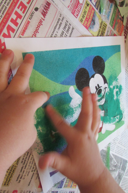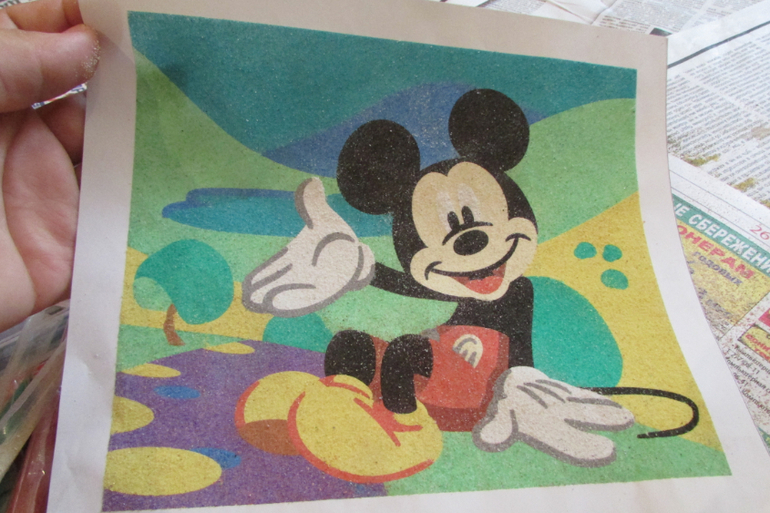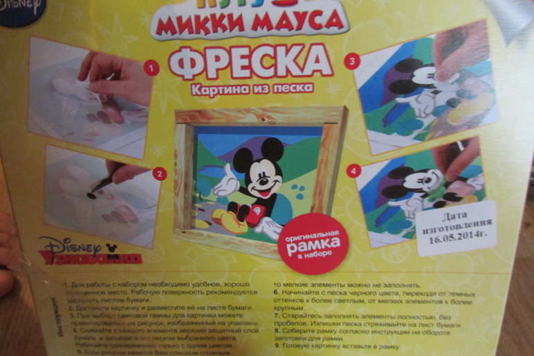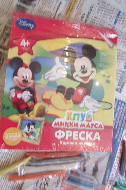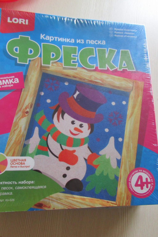 Вот такая интересная фреска из цветного песка производителя "Лори". Мы купили себе снеговика и Микки Мауса (на фото).![]()