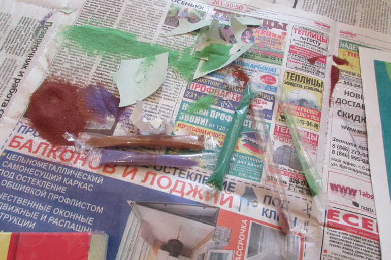 Смысл: есть пакетики с цветным песком и шаблон картины. На нем куски разных цветов вырезаны так, что ты просто убираешь одну часть (которая с подсказкой окрашена легким оттенком нужного цвета), остается липкий наклеечный слой. И сыпешь в это место песок цветной, слегка потом растираешь пальчиком для лучшего приклеивания, а остатки лишнего песка стряхиваются легко с картины. Потом следующую часть картинки по такому же принципу заполняешь.