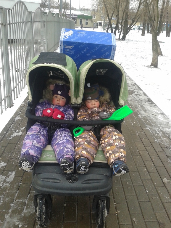 Вот так мы ехали с почты)))) Метель и ветер, коробка огромная поместилась только на крышу коляски: