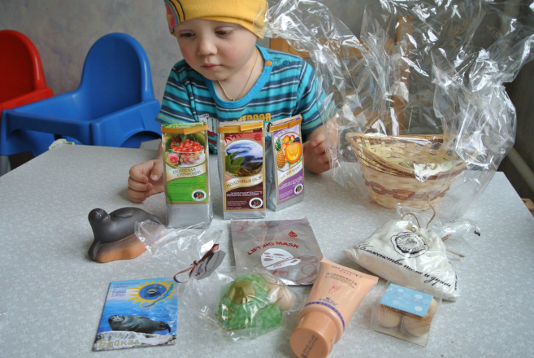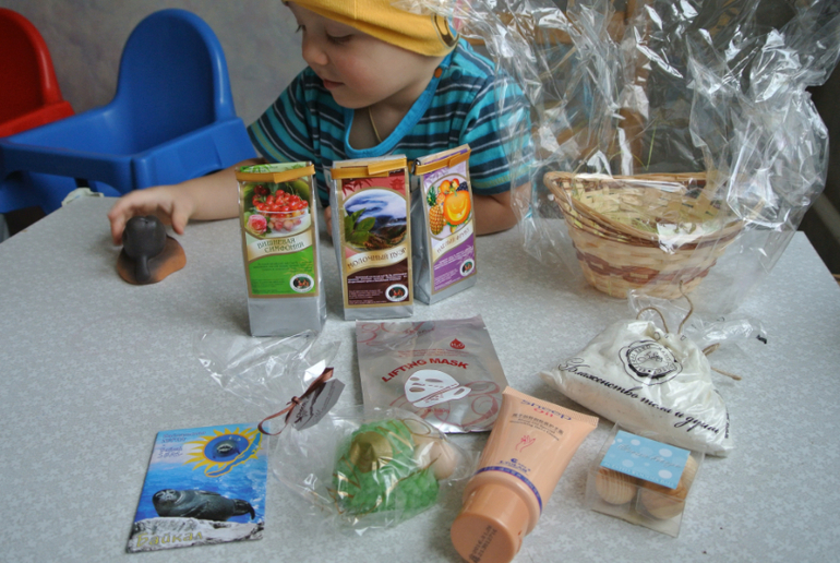 Книжка со сказками для детей, крем для рук, деревянные шарики для запаха белья, маска для лица, вкусное мыльце-овечка, статуэтка нерпы!!!!!! (это вообще улет!), магнитик, и три вида вкуснецкого чай! Я обожаю чай и кофе))))