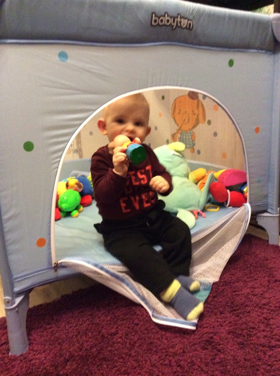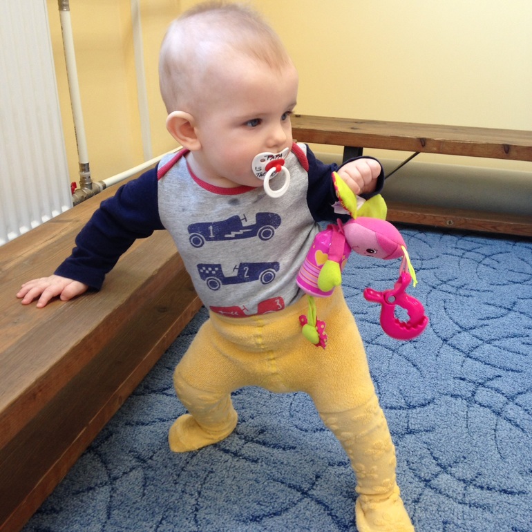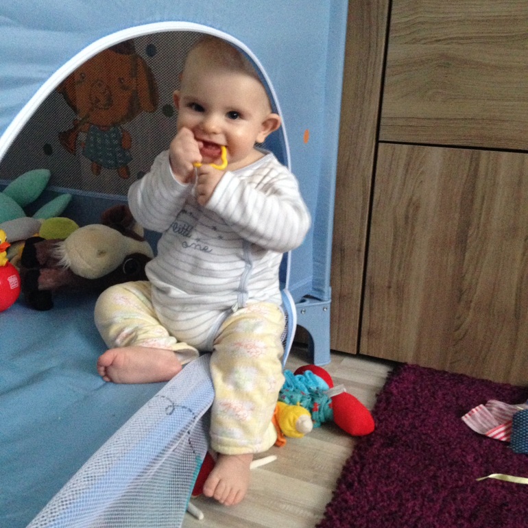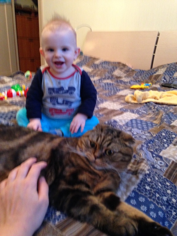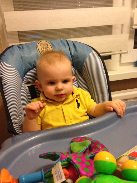 Значит так, вес 8630, рост 68,5. Кушает каши на завтрак и ужин, овощи и мясо на обед, на полдник пюрешки фрукты и печеньки. Пьет компот из сухофруктов. Кушает хорошо, какает хорошо, набирает вес только только, я списываю это на хороший обмен веществ и на его подвижность. В 6,5 месяцев Вова сел, в 7 встал на ноги в кроватке и манеже. Сейчас уже передвигается на ногах вдоль дивана. Ползает тоже отлично, гоняет по всей хате кота))) вчера я работала за компом, мля где ребенок думаю)) а он на кухне загнал кота за дверь и ржет))) ну вот такой шустрый. Кот кстати у него вызывает ржач))) и очень много положительных эмоций. А так из умений: гулит, ма па ба гу и тд. , играет с игрушками, может посидеть в манеже, постоять в кроватке, когда мне надо что то сделать по дому.