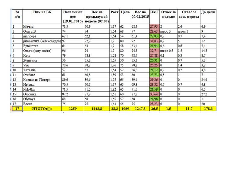Итак, нас сейчас 17 человек). Общий тоннаж - 1,259 тонны)))). Средний индекс массы - избыточный вес - 26,5.