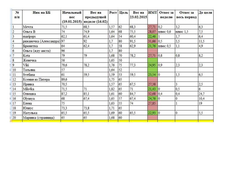 А можно меня внести в табличку, начинаю худеть, со следующей недели планирую возобновить спорт зал. Сейчас вес 65, планирую для начала похудеть до 60. Рост 168