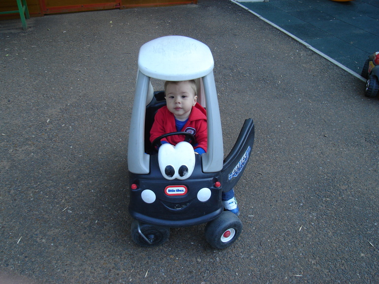 Обожает кататься на машине. Одной фразой "на би-би поедем" можно сразу вдохновить парня на самостоятельное одевание. Узнает папину машину. Указывает на нее пальчиком и говорит: "Папа би-би".