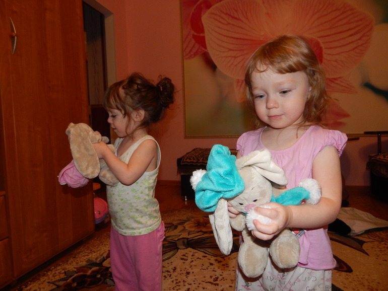 Зайки такие Мииилые! Нашими зайками мы играем, ложимся с ними спать, благополучно одеваем снимаем с них красивые шапочки!