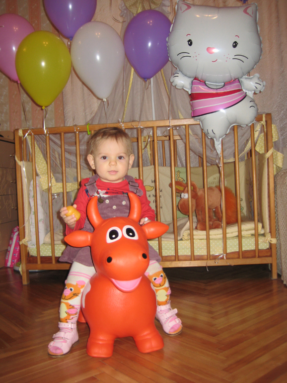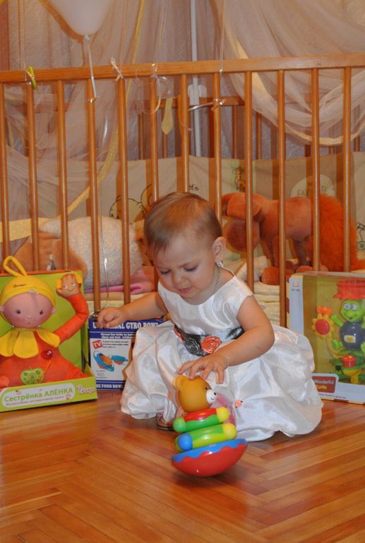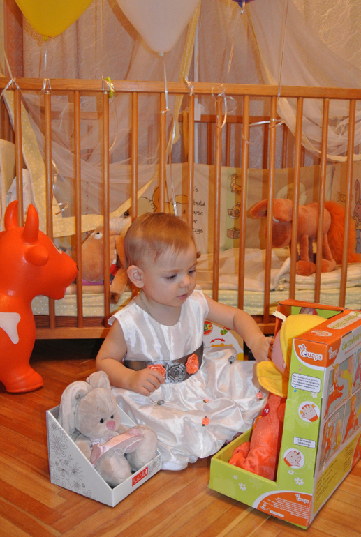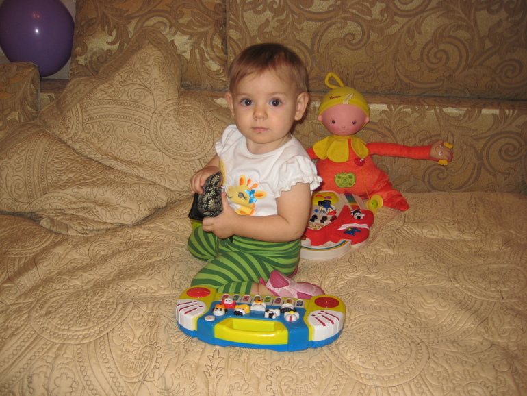 Весит 9 кг. рост 73 см. 6 зубов. размер ноги 18( резко выросла за месяц на 2 размера)... говорит мама, баба. ав-ав, тиса(киса), дай, неа, даа, и на своем тарабарском. Подпевает знакомые мелодии, танцует, ходит и уже не ползает вообще, как-будто и не ползала. Странно, как то... резко перестала. Играем: в кубики, пирамидку, стаканчики складываем, в мягкие игрушки... и машинки, а вот книги до сих пор не интересны, невропатолог сказала, что дети разные, просто у нее мир... более выражен, через реальные вещи.... мультики тоже не смотрит. В общем воспринимает пока мир, такой, какой есть на самом деле... Сказала, что бы я не грузилась и не старалась приучать силком, придет время сама проявит интерес, только периодически показывать книжки и смотреть на ее реакцию.