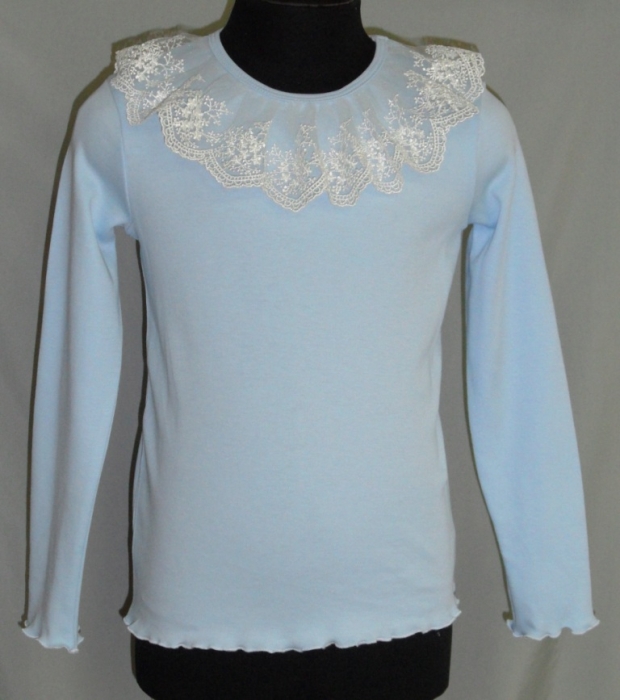 ПРОДАМ детскую одеждуДжемпер для девочки из однотонного полотна, по низу изделия и рукавов декоративная отстрочка, образующая слегка волнистый край, по переду изделия широкое присборенное кружево