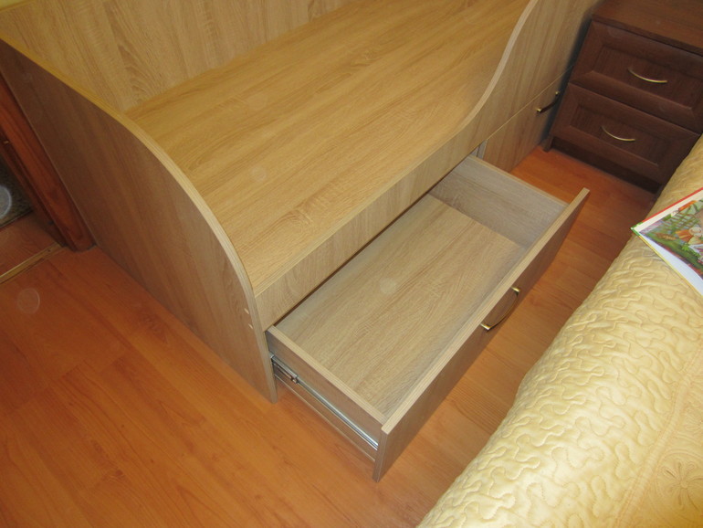 Детская кровать для малогабаритной квартиры. Размеры 164х74. Матрас 160х70. Для ребенка от 2 лет. Есть ограничительный бортик предотвращающий падение. Два вместительных ящика. Делали кровать под заказ. Кровать очень добротная. Фурнитура отличная. Матрас в подарок. Цена 10 тыс. Разумный торг. Б/ у 1,5 года. Состояние новой.