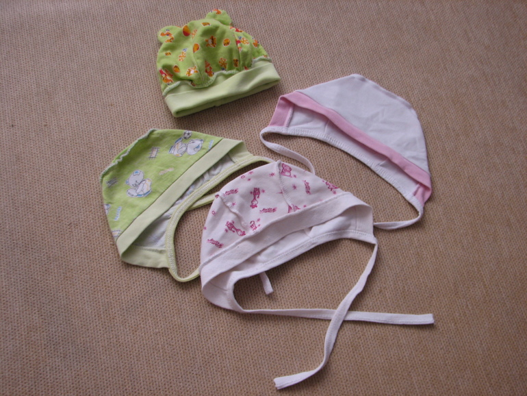 12. Шапочка с ушками и 3 чепчика, 0-6 мес. 100 руб за все.