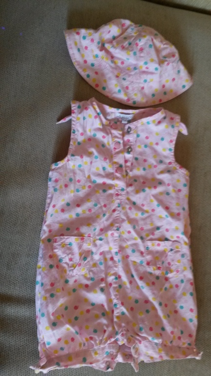 4. Комплект песочник и панамка, р. 86, на панамке указан размер 12 мес. Рисунок мелкие яблочки (на фото плохо видно). Одевали 1 раз, панамку чуть больше (в 18 мес подходила), состояние нового. 250 руб.