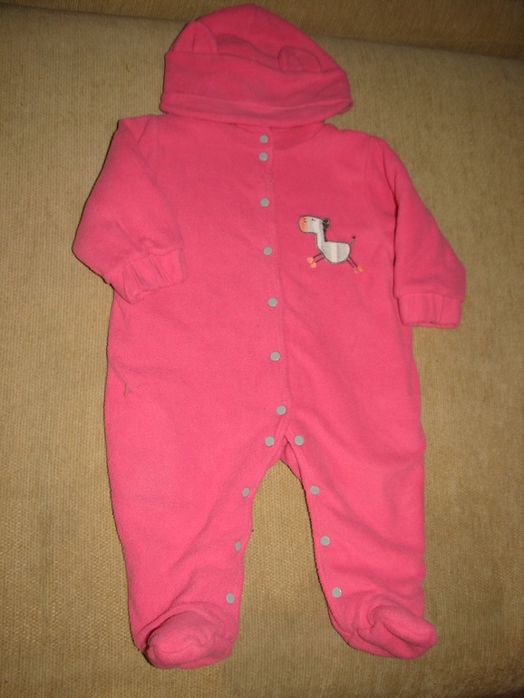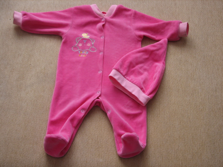 14. Комплект с шапочкой бархатный розовый 0-6 мес, б.у. возле одной кнопки чуть надорвана ткань. 100 руб.