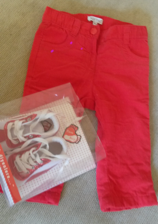 К штанам есть подходящие по цвету пинетки, подбирали для фотосессии (сиреневые блики на фото от телефона).