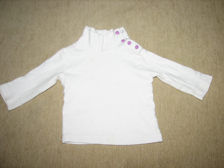 21. Водолазка хб, белая с сиреневыми кнопками по плечу, р-р 74. Бу 1 сезон. 50 руб.