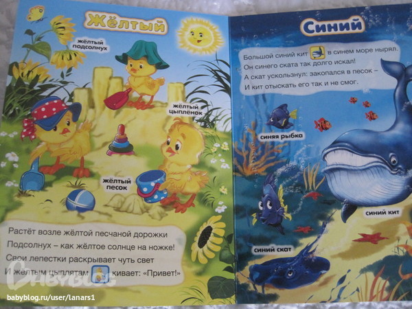 Итак, первая книга "Цвета". Каждая страница в книге посвящена определенному цвету. Например, желтый цвет – на страничке желтый цыпленок, жёлтая бабочка, солнышко, подсолнух, песок. При нажатии на кнопочку мы слышим «желтый цыпленок» и звук, который издает цыпленок.