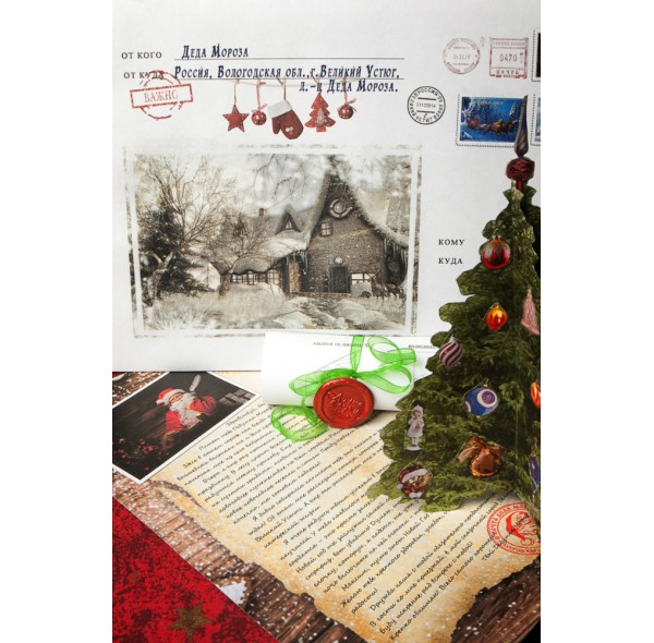 - Красочный именной большой (формат А4) конверт с новогодними марками, штампами и настоящей сургучной печатью.