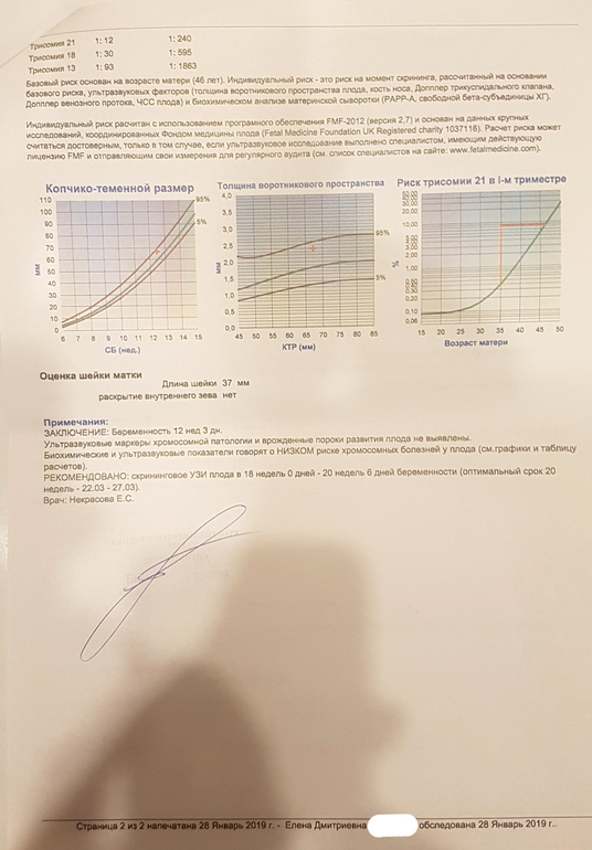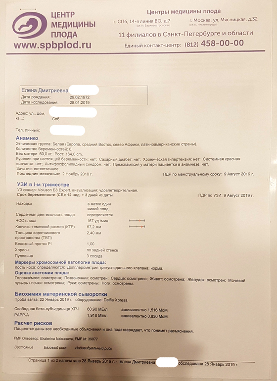 Индивидуальный риск болезни Дауна поставили 1:240. Сказали, что биопсию хориона делать не надо. Можно сделать НИПТ, но я, честно говоря, пожалела 20 тысяч. Сейчас думаю, что зря. Нужно было сделать.