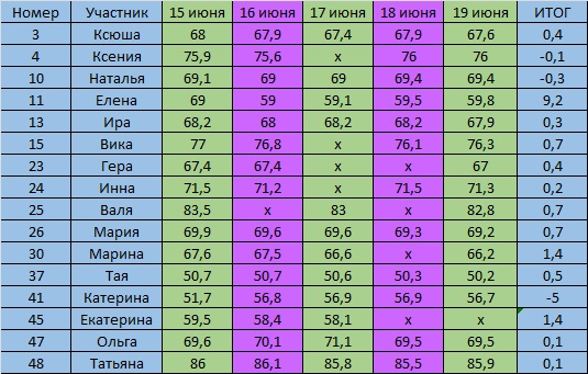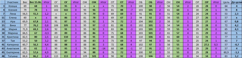 Во второй таблице как в прошлый раз, скрыла тех, кто взвешивается раз в неделю или отчитался по весу всего два раза.