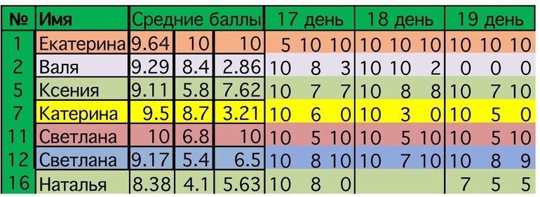 Вот уже 2/3 нашего марафона позади. Сделала новую сводную табличку с вашими средними баллами: