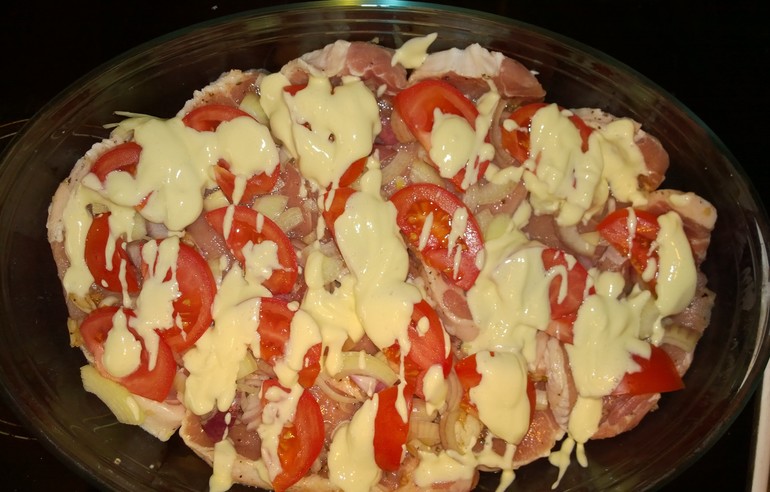 Выкладываем свинину в форму, сверху выкладываем лук, нарезанный полукольцами, помидоры полукольцами и поливаем немного домашним майонезом.