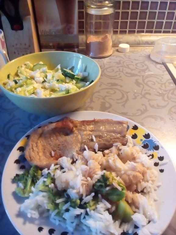 Салат из капусты, огурца и одна столовая ложка нежирного творога. Заправлено подсолнечным маслом. Мясо на кости. Две столовые ложки риса, брокколи и цветная капуста. Немного соевого соуса, т к рис и овощи не солила. За пол часа до обеда выпила 1 порцию протеинового коктейля с шоколадным вкусом.