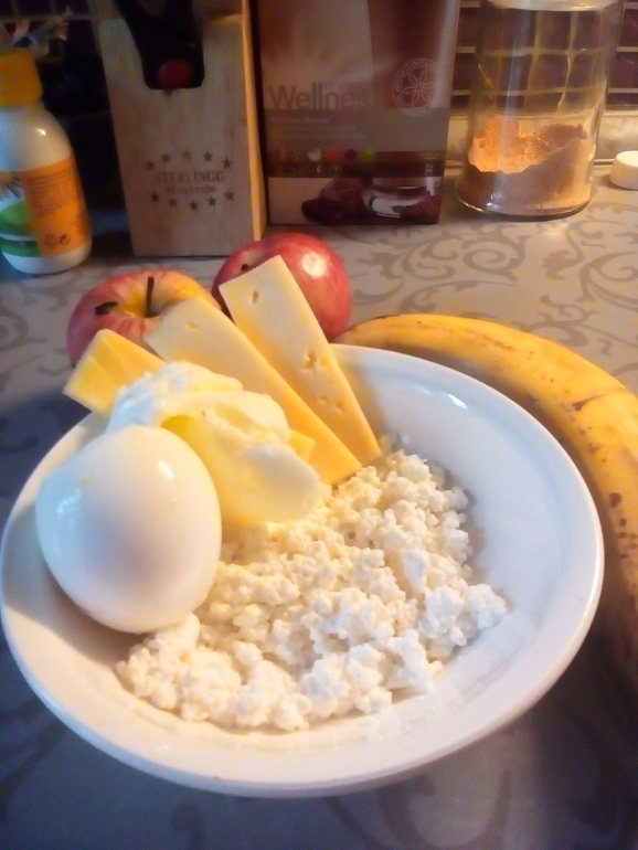 Творог обезжиренный подслащенный сахаром (сын вчера не доел, так я себе сахаром не слащу), сыр (самый обычный), два яйца (из одного убрала желток), фрукты.