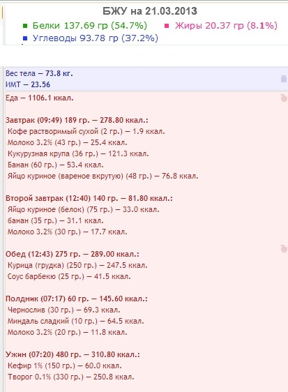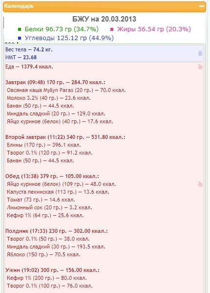 Рацион хороший, теперь я попробую есть больше орехов, еще мед в кашу с утра, что бы набиралось 1200 ккал.