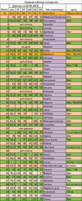 Хотелось бы обговорить такие вопросы: многие участницы не оставили мне начальных данных. Их можно дописать в этом посте с указанием номера, я допишу в таблицу. Если вы не можете отчитаться в понедельник по замерам - это можно сделать в любой другой день, главное - пишите данные в этом посте, а то я потом не найду ваши измерения. Если 3 недели подряд нет недельных отчетов, я буду считать участницу выбывшей (за исключением тех, кто предупредил, что не сможет какое-то время отчитываться (отпуск, дача, отсутствие интернета и др))))).