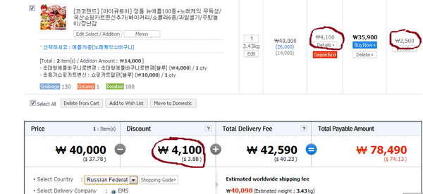 по доставке,вы её стоимость увидите в корзине при расчёте: я сформировала корзину-набор 76 шт+корзина+тележка ,получилось 40000 вон,продавец даёт скидку 4100 вон,но вы должны ещё оплатить доставку на склад ЕМС-это 2500 вон и выбираете страну доставки Россию-получается 42590 вон(это 40,23$),в итоге 40000 -4100+2500+42590=78490 вон(74,12$)