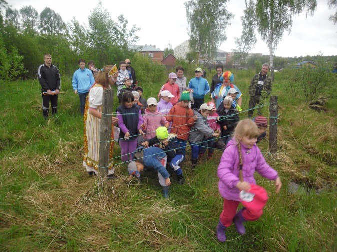 Нужны пакеты в рулоне голубого цвета, 3 шт, которые по углам прижимаются формочками с песком, чтобы не улетели. Несколько кругов из картона - это ямки. Задача прыгать через "речку" и не попадать в ямки, разложенные по бокам. Если кто-то попал в ямку -звать товарища, чтобы вытащил. Если кто-то в речку попал - превратился в рыбку, нужно звать товарища, чтобы удочкой-прыгалками вытащил на берег.