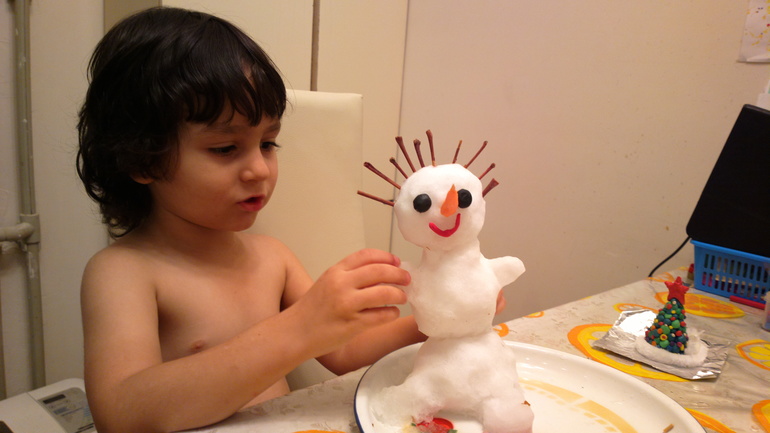 Вчера вечером, мы сделали на улице заготовку для снеговичка, принесли домой три шарика из снега, положили их на балкон, сделали из пластилина глазки и рот, из морковки-нос для будущего снеговика. И у нас получился вот такой потешный снеговичок.