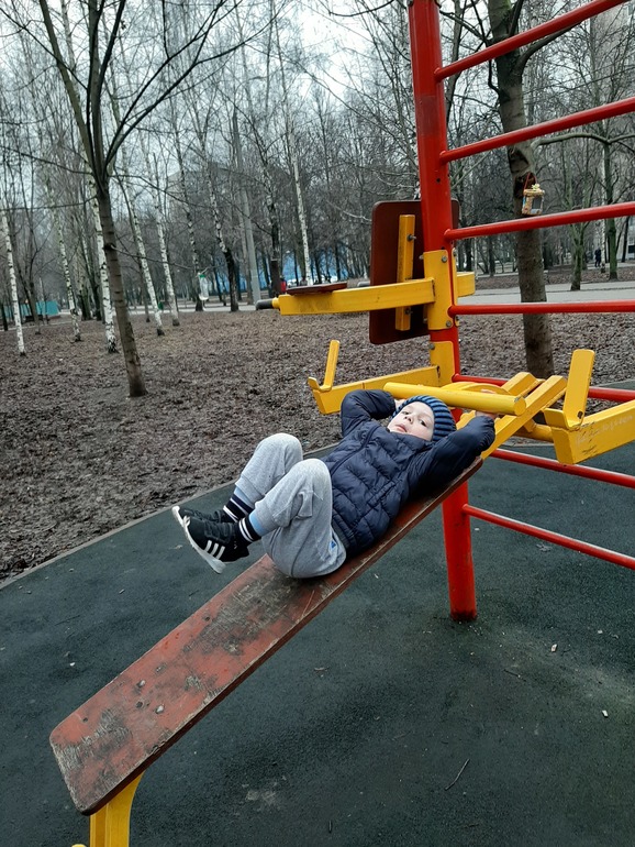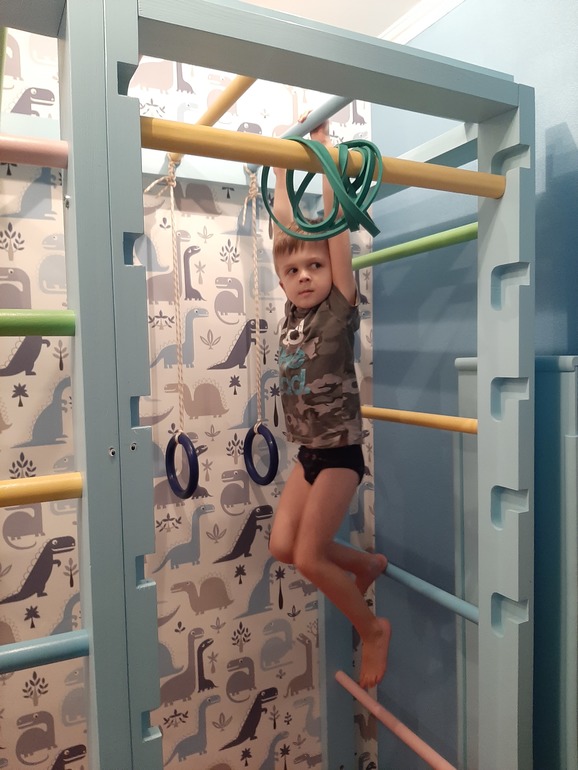 И вдруг проснулся интерес к спорткомплексу, то вообще на него не залезал, а тут как обезьянка, больше всего нравится на кольцах кувырки делать и залезать на рукоход и спрыгивать вниз на маты.