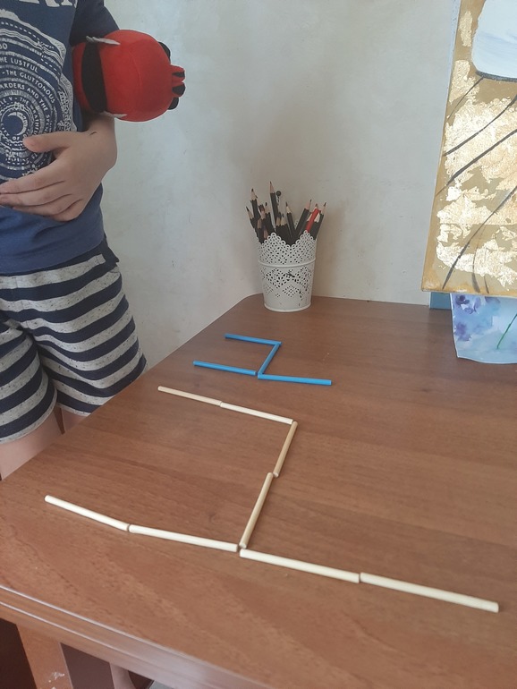 (это стул для гномика и стул для великана)3. Еще одно упражнение с палочками. Сначала выкладываем из палочек что-нибудь сами, ребенок повторяет. А потом он должен нарисовать, то, что он выложил.