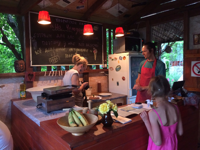 В хозяйском кафе "На Чемоданах" мало того, что очень вкусно кормят, так еще и дети имели возможность проявить свои таланты -Настя пела там песни под минусовку на телефоне