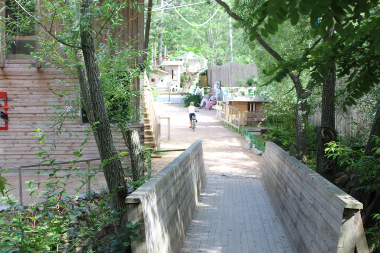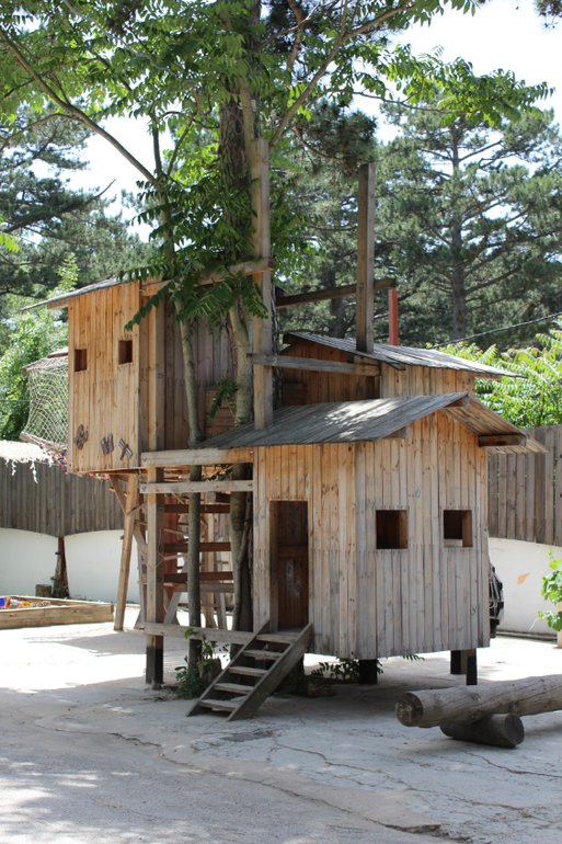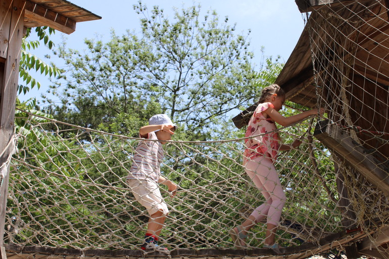 Когда попадаешь в это местечко первый раз,то не можешь понять,почему же его так расхваливали твои местные друзья:простые деревянные ворота,за ними огородики в коробках,мостик,сарай-сеновал,какие-то то ли склады,то ли мастерские АТП...Но тут твои дети несутся вперед,забираются на дерево-дом...Ты садишься на бревно рядом и ...понимаешь,как же тут хорошо! Воздух-сказка,тихо,мало людей..