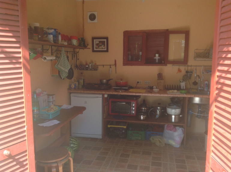 Летняя кухня и навес-беседка для семейных посиделок и трапез. Само собой полное наличие кухонных приборов, посуды и т.п
