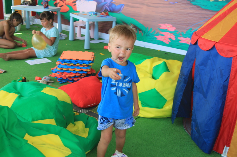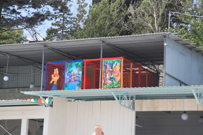Мы приехали в Ялту 12 июня, было довольно прохладно и мы ходили сначала в кофтах и даже в курточках, отдыхать мы собирались до конца июня и я думала, что искупаться не получится, вода будет холодная, почему-то думала что море только в июле прогревается, но меня ждал сюрприз)) Через дней 5 начало стремительно теплеть, муж улетел домой, я осталась одна с детишками и ждала прилета моей мамы, к ее прилету погода совсем разгулялась и началась ЖАРА)) Море 26 градусов, я такого теплого моря никак не ждала, это был отличный сюрприз) Единственное, что омрачало наш отдых- частые штормы. Я не любитель волн, а дети и подавно, Дамир вообще отказывался сидеть на пляже из-за волн, тут нам на помощь пришла детская комната, которая очень удачно расположилась около пляжа, сдать ребенка на час стоило около 200 рублей, комнату видно с пляжа, на втором этаже был игровой лабиринт, там тоже можно было оставить детей, так как мои малыши очень боялись волн и просились уйти, я начала их сдавать в комнату или лабиринт и все были счастливы)) И мы с мамой и детишки.