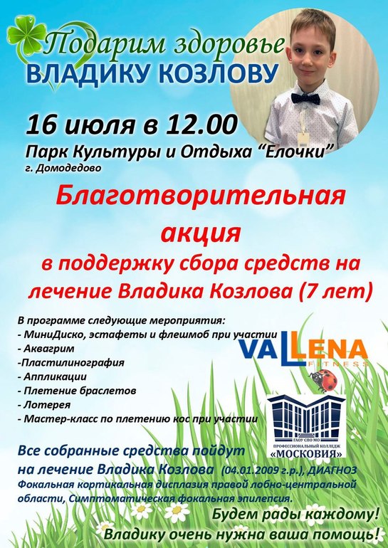 Все, кто захочет, приходите в Парк Культуры и отдыха "Ёлочки" в г. Домодедово в эту субботу, 16 июля в 12.00. Вы сможете увлекательно провести время с семьёй и повеселиться! А у Владика появится ещё больше шансов на нормальную и счастливую жизнь. Мы будем танцевать, учиться чему-то новому и интересному и выигрывать украшения в беспроигрышной лотерее!