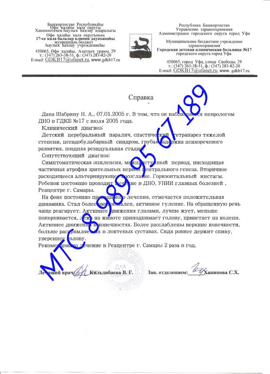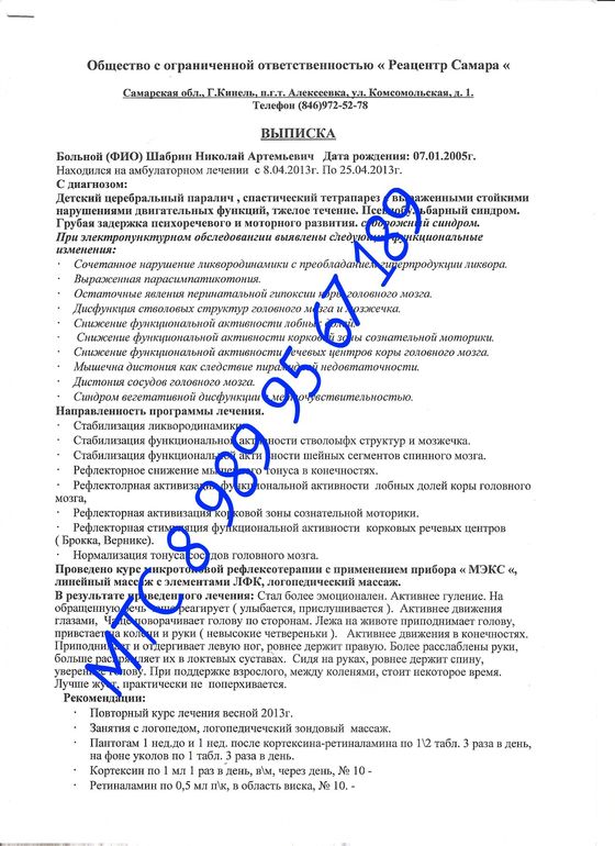 Расскажу немного о себе и своём сыне Николае. Родился Коленька 7 января 2005 года. По шкале Апгара ½ балла, сразу после рождения впал в кому, 10 дней был между жизнью и смертью. Находился на аппарате ИВЛ (Искусственная Вентиляция Лёгких). Когда Коля был в реанимации, мой день делился на две половинки, до 14.00 (начало посещения в отделении) и после. Я специально поздно ложилась спать, чтобы утром не встать рано, так как иначе время до обеда тянулось бы катастрофично долго. 21 января состояние стабилизировалось, и его перевели в отделение патологии новорожденных (ОПН). Состоялась беседа с лечащим врачом, прогнозы были самые худшие… В конце нашего разговора мне предложили отказаться от сына. Я была, мягко говоря, в шоке!!! Меня шокировали не прогнозы, а её предложение. И так продолжалось ещё несколько месяцев. Ни кто не давал надежд, ни кто не хотел лечить. У меня произошёл нервный срыв, который сильно подорвал моё здоровье. Было ощущение, что пытаешься открыть дверь, от которой у тебя нет ключа. И все, кто хоть как-то может тебе помочь, найти это ключ, отворачиваются от тебя. Моральные и физические силы были на нуле и вот именно в тот момент, на моём пути встретились специалисты, которые действительно любят свою работу. Появилась надежда, и стали появляться результаты от лечения. Мой Вам совет: верьте!!! Иначе ни чего не будет получаться. Но в то же время не одевайте розовых очков, когда их стёкла разобьются, бывает ещё больнее. Постарайтесь быть объективным по отношению к своему ребёнку. На данный момент я удовлетворена нашими результатами, но стремиться нужно всегда к лучшему. Мы продолжаем лечение, продолжаем борьбу за право жизни в столь суровом обществе…