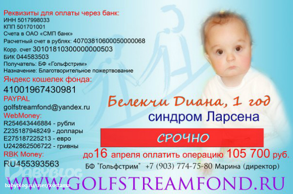 Операция назначена на 16 апреля! К этому времени необходимо полностью оплатить счет. Ситуация очень срочная, времени мало, просим оказать помощь!
