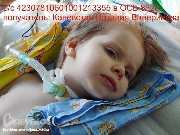 КАНЕВСКОЙ ЛИЗЕ, 3 года!! Ее диагноз НЕКРОТИЗИРУЮЩИЙ ЭНЦЕФАЛИТ, вирус поразил участок головного мозга, отвечающий за дыхание, поэтому она не может самостоятельно дышать.Но у Лизы появился шанс, на другую жизнь!!!В октябре 2012 года Лизу ждут в ШВЕЦИИ на операцию по установке диафрагмального стимулятора МАРК 4,который позволит Лизе дышать самостоятельно!! Сумма к сбору на операцию и транспортировку носилочного больного в РУБЛЯХ - 3 824 898,87!!!