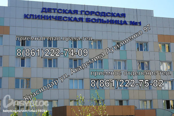Краснодарская городская детская больница № 1 Адрес: 350000, г. Краснодар,ул. Академика Лукьяненко, 97 8-(861) 222-74-09 - приемная глав.врача 8 -(861) 222-75-82 - приемное отделение