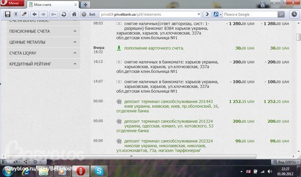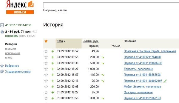 ЯндексДеньги:31.08.2012 - 2219.50 рублей01.09.2012 - 95.00 рублей02.09.2012 - 1340 рублей03.09.2012 - 749.26 рублей04.09.2012 - 1200.00 рублей
