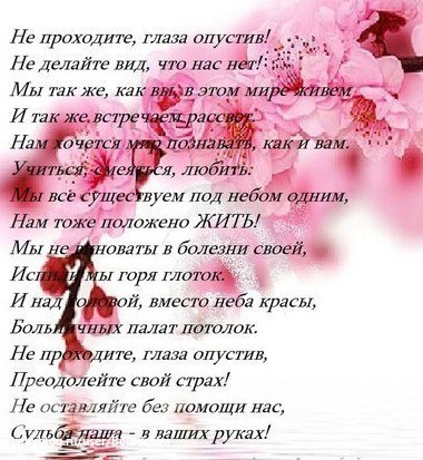 Вы знаете, что шепчет ночью мать, Когда больной ребенок засыпает? Да, молится. Не трудно угадать - Она здоровья малышу желает. Смахнув слезу, покусывая губы - Мольба, молитва и обрывки фраз. И с выдохом, сжимая крепко зубы: О, Боже, Боже! Помоги сейчас! Но есть слова в молитве матерей - Они их шепчут, теребя одежду: О, Господи! Благослови людей, Всех, кто помог и подарил надежду!