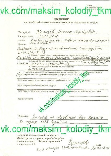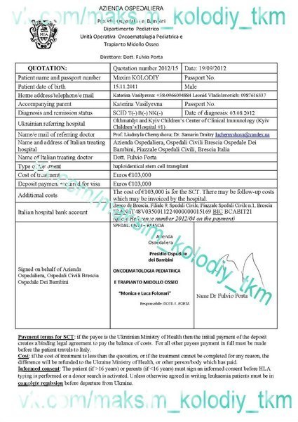 Данное заболевание генетическое, мама или папа мальчика донорами быть не могут, а значит и операция в Украине тоже невозможна. Малышу предстоит ТКМ,счёт клиникой выставлен на 103 тыс. евро. Для родителей малыша это неподъемная сумма! А времени у Максима совсем немного, деньги нужно собрать до 15 ноября!